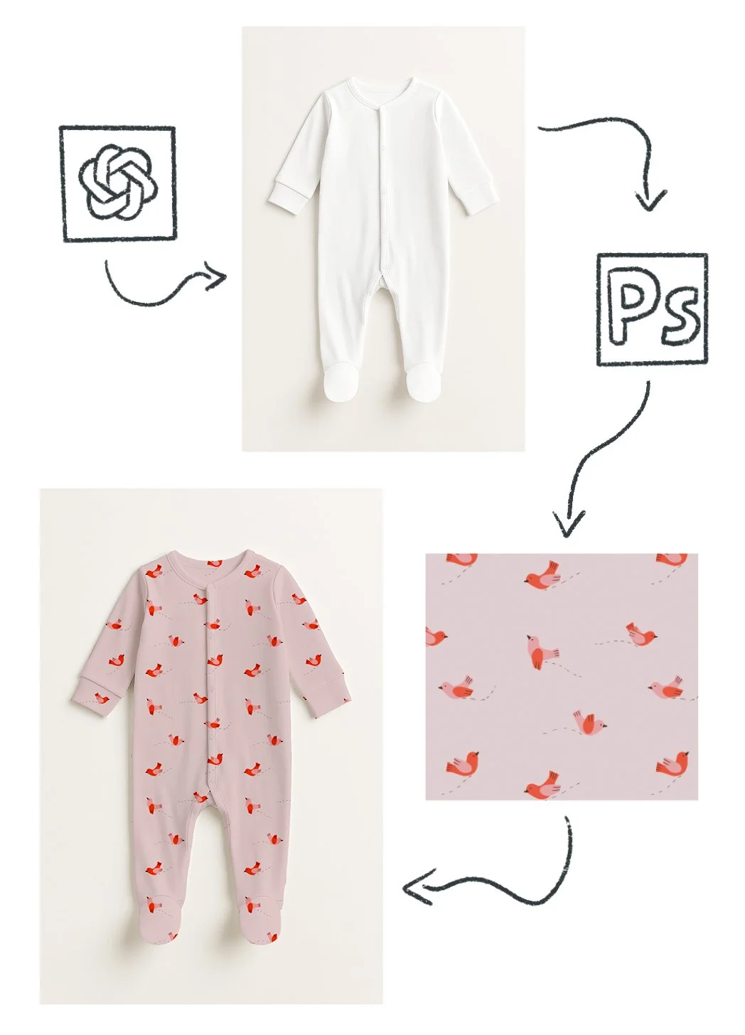 Simple product prompt (”generate a plain baby sleepsuit”) + my bird pattern applied in Photoshop. The AI-generated blank gave me exactly the angle I needed without hunting through stock sites.