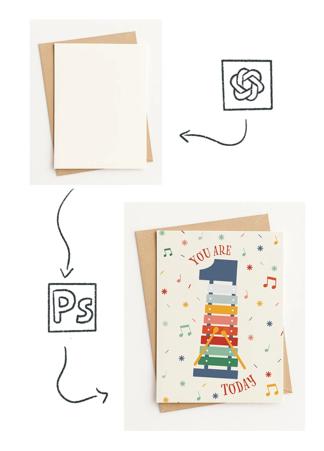 This works for placement art too, not just repeat patterns. ChatGPT generated a blank card, I applied my kids birthday xylophone illustration in Photoshop. Same process, different product.