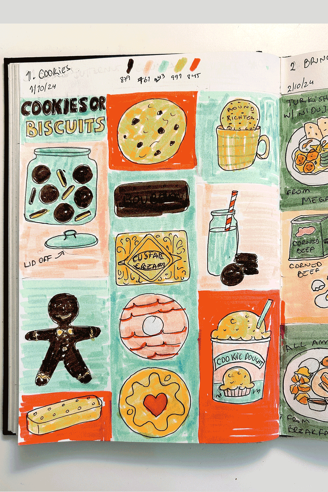 At the start of the challenge, I reviewed the prompt list so I could plan my ideas. For some prompts, like “Salty Snack” (#3), I already knew I wanted to draw a pack of Wotsits giants (a favourite of mine and the closest the British have to a classic pack of Cheetos!), and for “Cookbook” (#12), I was excited to illustrate my concept for a baby weaning cookbook. Knowing these prompts ahead of time helped me focus and reduced the overwhelm of having to think on my feet each day.
